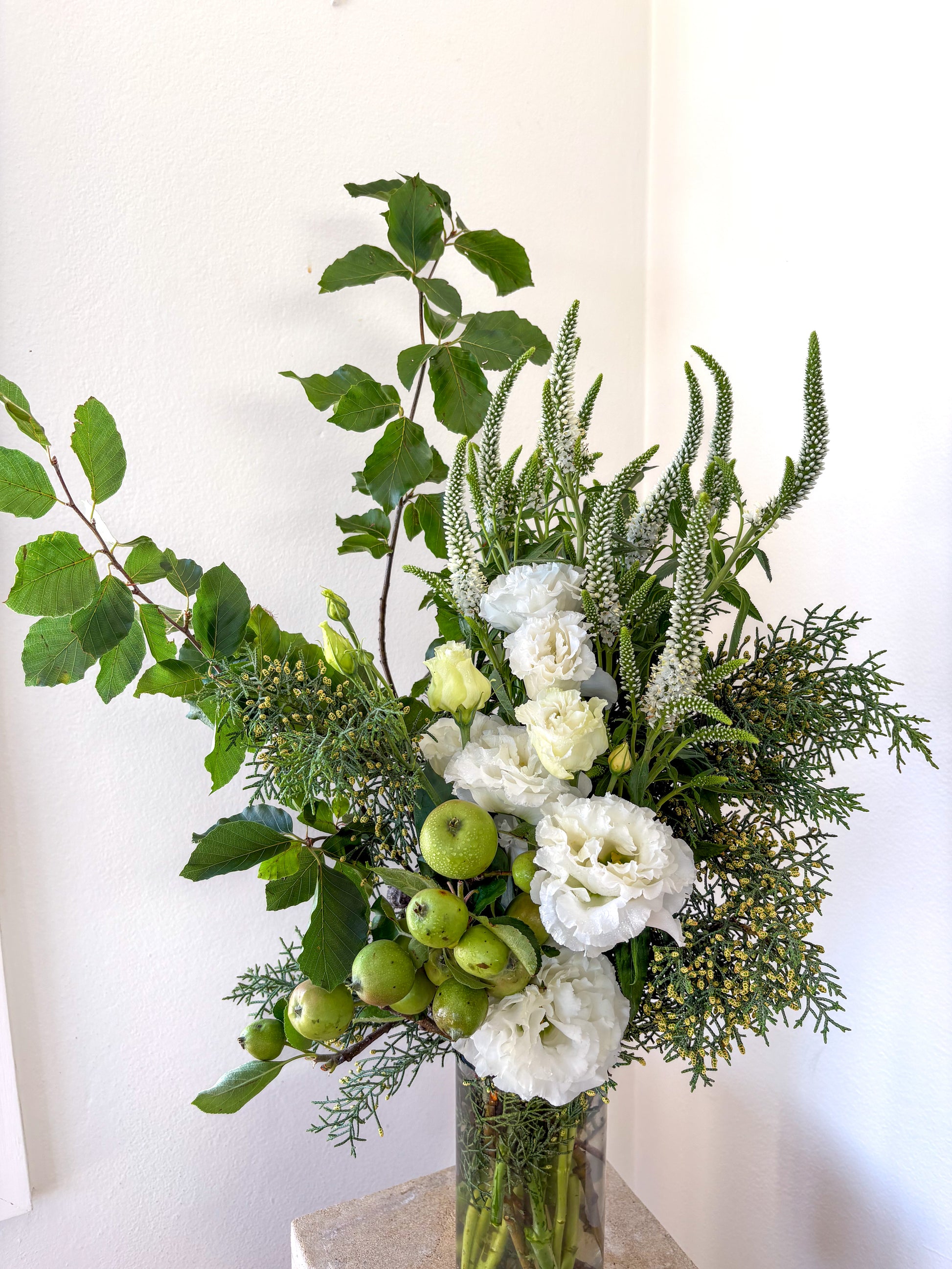 Elegant and refined composition featuring timeless tints, tones and shades of green, creams and white.